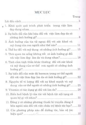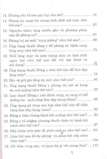 Quyển sách dùng hình thức hỏi- đáp, bắt đầu tìm hiểu từ cơ sở làm đẹp dung nhan bằng Đông y, dùng lý luận Đông y và Tây y trình bày rõ những nhân tố, bệnh tật có ảnh hưởng tới mỹ dung, cùng với việc ứng dụng thuốc Đông y như thế nào để tiến hành dự phòng và chữa trị.