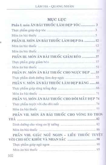 Sách giới thiệu các thực phẩm, món ăn và bài thuốc cho nhan sắc phụ nữ, giúp làm đẹp tóc, da, giảm béo, cho ngực đẹp, làm đẹp răng, cho đôi mắt đẹp, vòng eo thon thả, giúp cho giấc ngủ ngon- liều thuốc tuyệt vời cho sức khỏe và nhan sắc.