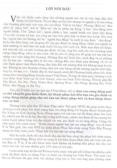 Đây là cuốn sách rất cần thiết cho cán bộ làm công tác Phục hồi chức năng ở tuyến cộng đồng. Đồng thời nó cũng là tài liệu tham khảo hết sức hữu ích cho các Bác sĩ, Y sĩ, Y tá nhi khoa biết cách khám và hướng dẫn phục hồi cho các cháu tàn tật.