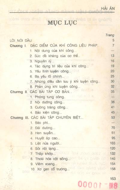 - Chương III: Các bài tập chuyên biệt: Chữa 10 bệnh khó: Béo phì, Đái đường, Hen suyễn, Huyết áp cao, Liệt nửa người, Sỏi nội tạng, Thấp khớp, Thoái hóa cột sống, Viêm xoang, Xơ gan cổ trướng.