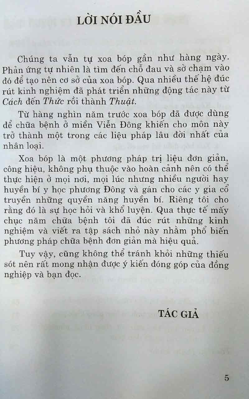 Tập sách nhỉ này là kinh nghiệm qua hơn 20 năm phục vụ bệnh nhân bằng kỹ thuật xoa bóp của tác giả nhằm cung cấp cho bạn đọc những kiến thức thực tế về một số bệnh thường gặp như: vẹo cổ cấp; ù tai, buốt tai; đau đầu; liệt VII ngoại biên; viêm quanh khớp vai...., góp phần xoa dịu đau đớn cho bệnh nhân.