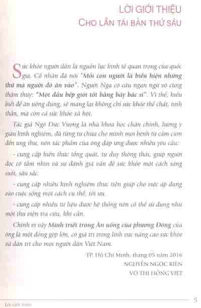 Quyển sách này có thể xem là “những kiến thức khoa học đích thực về dinh dưỡng”, là cẩm nang chăm sóc, nâng cao sức khỏe cho chính bản thân và gia đình.
