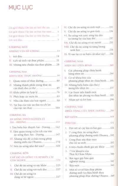 - Chương ba- Ăn uống theo nguyên lý Âm- Dương: Tìm hiểu về học thuyết Âm- Dương, tầm quan trọng và lợi ích của việc ăn uống theo Âm- Dương, phép dưỡng sinh Ohsawa…