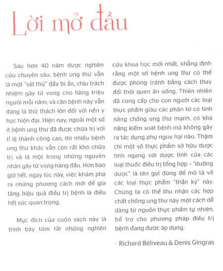 Cuốn sách này trình bày tóm tắt những nghiên cứu khoa học mơi nhất, khẳng định rằng một số bệnh ung thư có thể được phòng tránh bằng cách thay đổi thói quen ăn uống. Sách gồm có 3 phần: