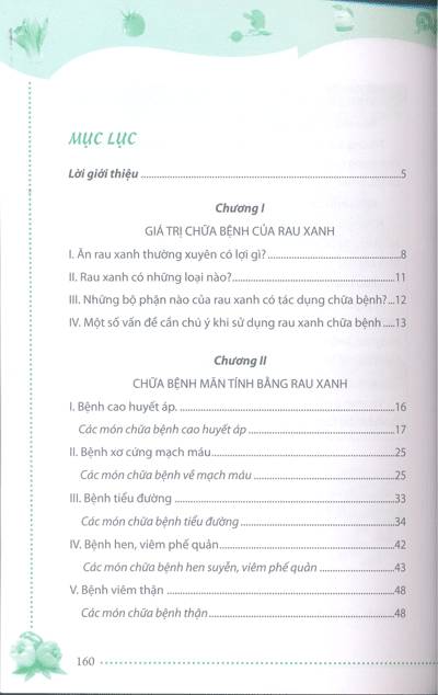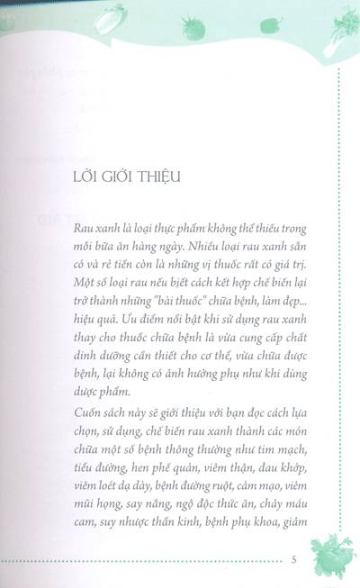 Sách giới thiệu cách lựa chọn, sử dụng, chế biến rau xanh thành các món chữa một số bệnh thông thường như tim mạch, tiểu đường, hen phế quản, viêm thận, viêm loét dạ dày, bệnh đường ruột, bệnh phụ khoa, giảm cân, làm đẹp…