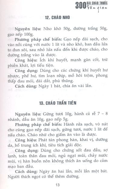 Sách giới thiệu 300 bài cháo thuốc có nguồn gốc từ Thực vật (186 bài) và Động vật (114 bài). Công thức nấu đơn giản, nguyên liệu dễ kiếm, chế biến dễ dàng, chất lượng chữa bệnh và dưỡng sinh cao.