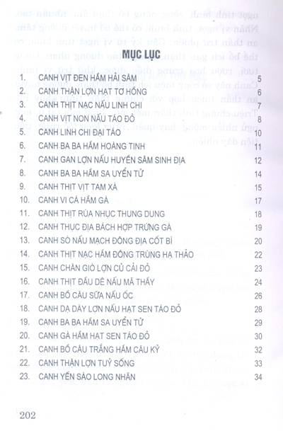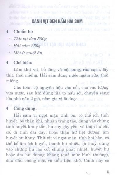 Quyển sách giới thiệu gần 150 bài thuốc- là canh dưỡng sinh để bồi bổ, phòng và chữa bệnh cho nam giới. Mỗi bài đều trình bày chi tiết nguyên liệu chuẩn bị, cách chế biến và công dụng, giải thích tác dụng của từng nguyên liệu trong món canh.