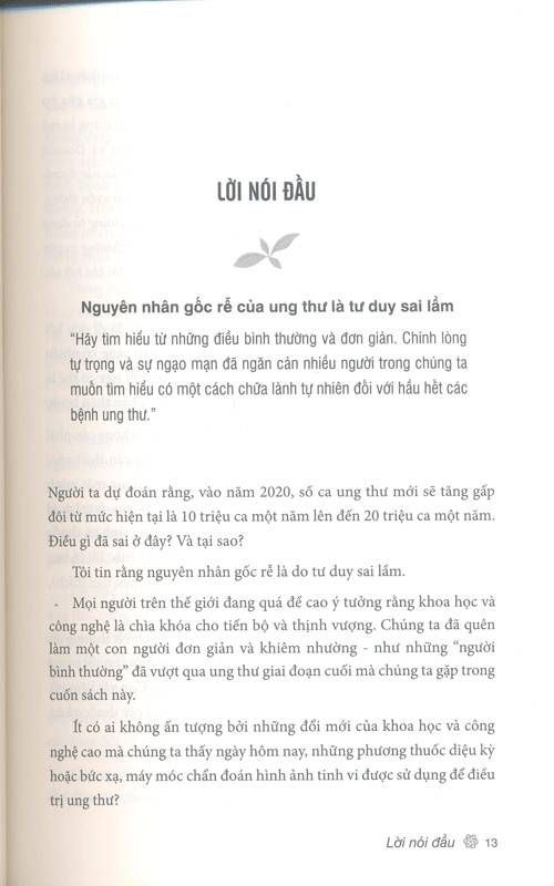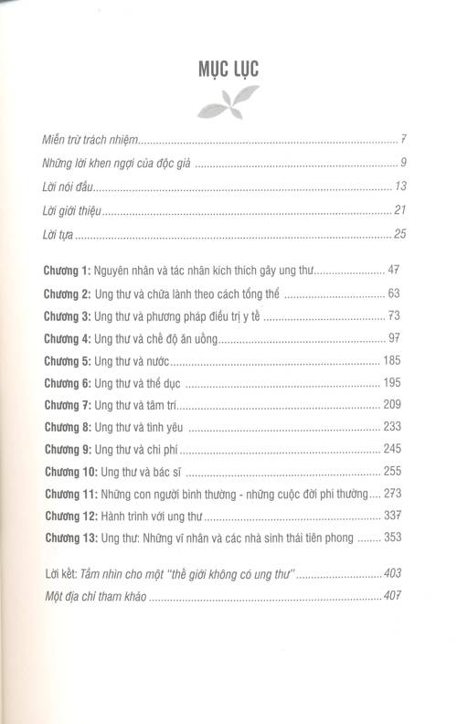 Cuốn sách gồm 13 chương, cung cấp cho độc giả cái nhìn tổng quan nhất về bệnh ung thư, khái quát được hầu hết các phương thức chữa bệnh tự nhiên cho bệnh nhân ung thư:
