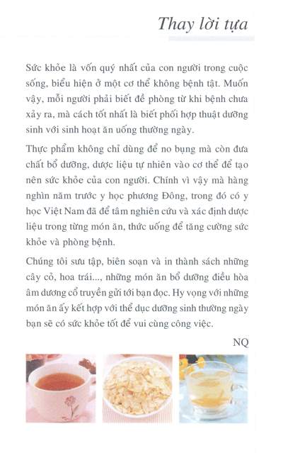 Tác giả đã sưu tầm, biên soạn và in thành sách những cây cỏ, hoa trái… những món ăn bổ dưỡng điều hòa âm dương cổ truyền gửi tới bạn đọc. Hy vong với những món ăn ấy kết hợp với thể dục dưỡng sinh hàng ngày bạn sẽ có sức khỏe tốt để vui cùng công việc.