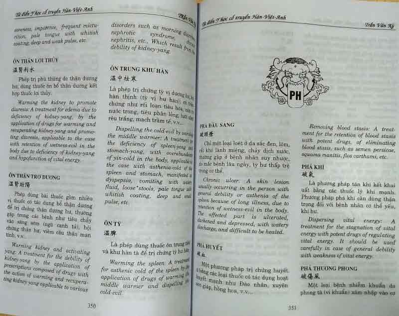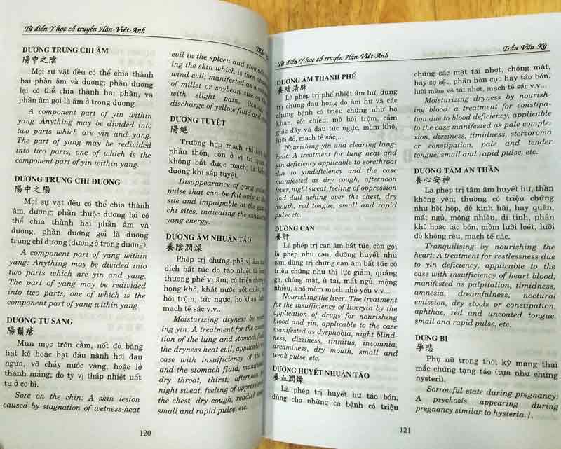 Cuốn sách này gồm khoảng 3500 thuật ngữ và từ bao gồm các môn lý luận cơ bản, nội, ngoại, phụ sản, nhi, ngoài da, mắt, rǎng hàm mặt, tai mũi họng....Các từ và thuật ngữ đều sử dụng âm Hán, giải thích bằng tiếng Việt và tiếng Anh. Đối với những từ chưa có từ tương ứng của tiếng Anh chúng tôi giữ nguyên từ Hán phát âm theo Tân vǎn tự - là ngôn ngữ đã được dùng nhiều trong các sách viết về Y học cổ truyền bằng tiếng Anh để bạn đọc dễ hiểu - ví dụ như các từ âm, dương, chí âm, thiếu âm, thái dương, dương minh...dịch sang tiếng anh là yin, yang, zhiyin, shaoyin, taiyang....Ngoài ra có thêm hai bảng phụ lục đối chiếu tên thuốc cổ truyền theo tiếng Việt- Latin- Hoa giúp bạn đọc tham khảo.