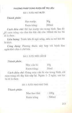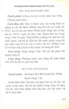 - Phần II: Phương pháp dùng rượu để chữa bệnh: giới thiệu về rượu thuốc chữa các loại bệnh hay gặp thuộc về nội khoa như: bệnh nôn, nấc, đổ mồ hôi trộm, loét dạ dày- hành tá tràng...; ngoại khoa (theo y học cổ truyền) như: bệnh trĩ, ghẻ...; phụ khoa: thiếu sữa sau sinh, kinh nguyệt không đều...; bệnh tiết niệu và hệ thống sinh dục như: liệt dương, di tinh...; bệnh mắt- tai- mũi- họng như: viêm họng cấp tính, nghễnh ngãng, đau răng, thị lực kém....