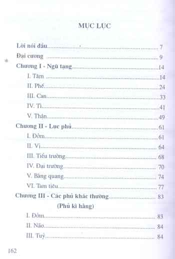 Chương 4: Nói về quan hệ giữa các tạng phủ, gồm: Quan hệ giữa các tạng, quan hệ giữa các phủ, quan hệ giữa tạng và phủ, quan hệ bệnh lý giữa tạng phủ.