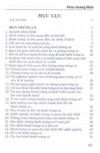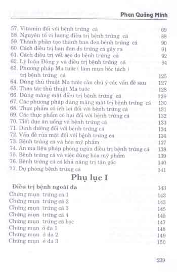 - Phần Mụn trứng cá: Trình bày 74 vấn đề về mụn trứng cá như: Nguyên nhân, yếu tố liên quan gây phát sinh mụn trứng cá, các loại mụn, chẩn đoán, các phương pháp trị mụn, lý luận Đông y và điều trị mụn trứng cá, ăn uống- vệ sinh- dự phòng bệnh trứng cá…
