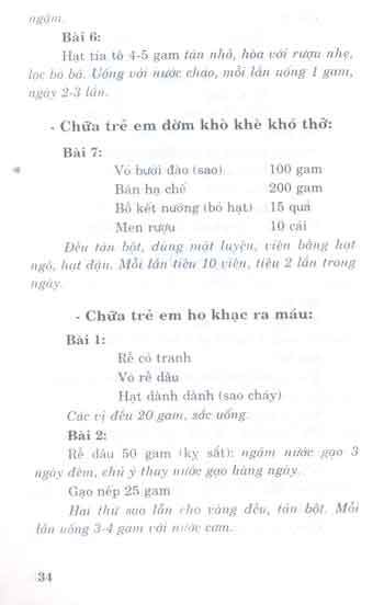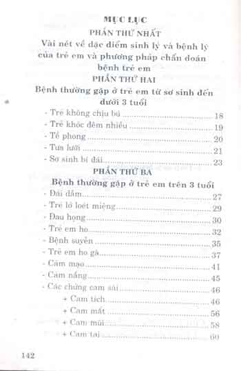 - Phần thứ ba- Bệnh thường gặp ở trẻ em trên 3 tuổi: Gồm 25 tật bệnh thông thường như: Đái dầm, lên sởi, cảm mạo, cam sài, mọc răng, chậm nói, chậm đi, ít tóc, mề đay, mồ hôi trộm…