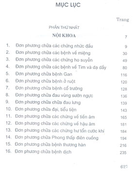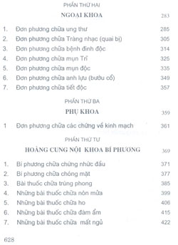 Sách này chia ra Nội khoa, Ngoại khoa, Nhi khoa, Phụ khoa, có những khoa riêng chữa về Tai, Mũi, Họng, Răng, Mắt, bệnh ngoài da và bệnh lạ, bệnh khó… Với 350 chứng bệnh khác nhau, với 600 bài thuốc bí truyền từ xưa đến nay, đã qua nhiều kinh nghiệm, đã được in trên nhiều sách báo.
