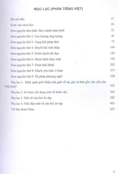 Các kinh văn chọn đọc: Gồm 9 đơn nguyên: Bảo mệnh toàn hình, Âm dương ứng tượng, Tạng khí pháp thời, Huyết khí tinh thần, Kinh mạch chi đạo, Bách bệnh thủy sinh, Hình thái bệnh, Mạch yếu tinh vi luận, Dị pháp phương nghi.