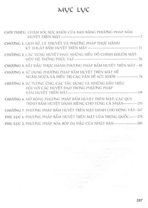 - Tác giả đưa ra 13 biểu đồ tóm tắt cơ bản để xác định vị trí 57 huyệt trên mặt được đánh dấu theo con số và mô tả rõ ràng những vùng huyệt tương ứng trên cơ thể. Những biểu đồ này luôn có phần theo sau chú thích dễ hiểu về phương pháp xoa bóp cơ bản và kỹ thuật bấm huyệt.