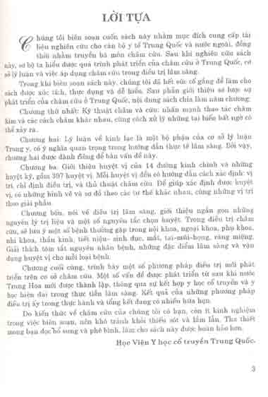 - Chương IV- Điều trị lâm sàng: Nói về điều trị lâm sàng, giới thiệu ngắn gọn những nguyên lý trị liệu và một số nguyên tắc chọn huyệt.