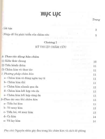 - Chương I- Kỹ thuật châm cứu: Nhấn mạnh thao tác châm kim và các cách châm khác nhau, cách xử lý các tai biến bất ngờ có thể xảy ra.