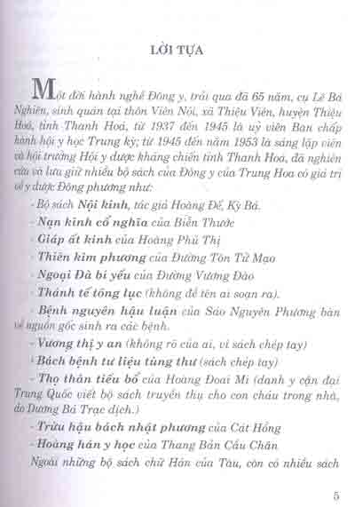 Quyển sách này là bộ sưu tập các bài thuốc và luận thuyết trị nghiệm của cố nhân, do cụ Lê Bá Nghiên dày công đúc kết bằng lý thuyết và thực hành. Sách gồm các nội dung chính: