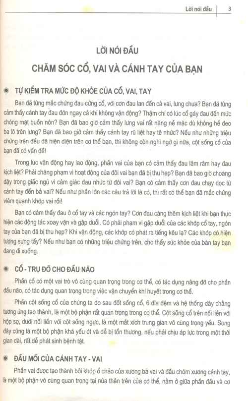 Cuốn sách này sẽ hướng dẫn cho các bạn những kiến thức thiết thực nhất về cách chăm sóc, bảo vệ phần cổ, vai, tay cùng các phương pháp tự chẩn đoán, tự điều trị những chứng bệnh thường gặp ở ba bộ phận này.