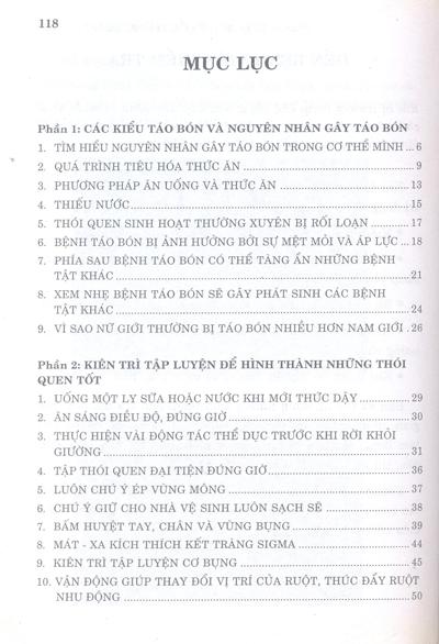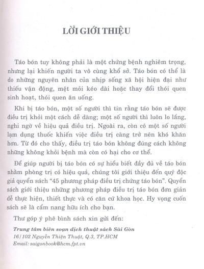 Qua đó, quyển sách giới thiệu những phương pháp điều trị táo bón đơn giản dễ thực hiện, thiết thực và có căn cứ khoa học.