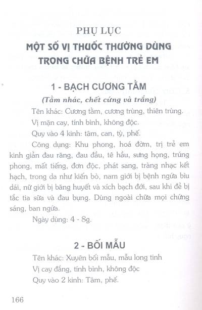 Cuối sách có phần phụ lục một số vị thuốc thường dùng trong chữa bệnh trẻ em, gồm 57 vị. Mỗi vị thuốc đều kèm theo mô tả tên gọi khác, tính vị, quy kinh, công dụng, liều dùng, cách dùng và những điều cần lưu ý.