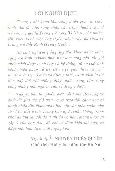 Cuốn sách này được biên dịch từ quyển “Trung y nhi khoa lâm sàng thiển giải”, là cuốn sách tóm tắt lâm sàng chữ các bệnh thường gặp ở trẻ em.