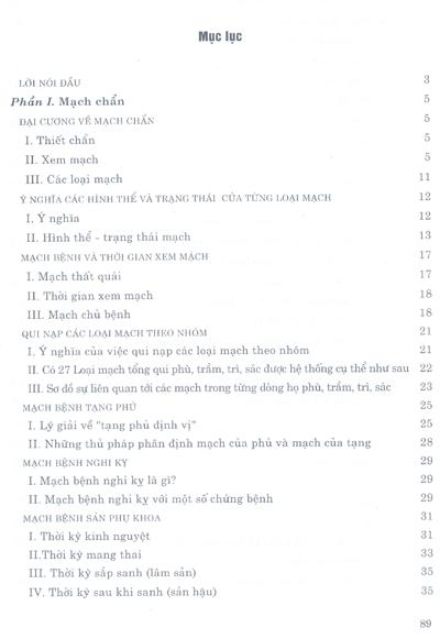 - Phần I - Mạch chẩn: Đại cương về mạch chẩn; Ý nghĩa các hình thể và trạng thái của từng loại mạch; Mạch bệnh và thời gian xem mạch; Quy nạp các loại mạch theo nhóm; Mạch bệnh tạng phủ; Mạch bệnh nghi kỵ; Mạch bệnh sản phụ khoa; Mạch và các chứng bệnh ở trẻ em; Bảy mạch bất thường; Minh họa các sóng mạch theo Y học Hiện đại.