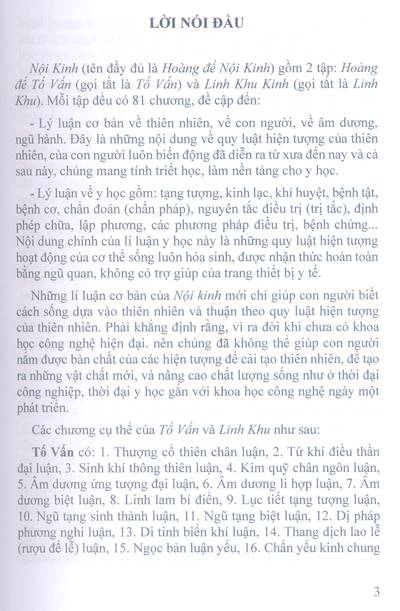 Sách sẽ cung cấp cho người muốn hiểu biết những nội dung gốc âm Hán Việt, dịch ra tiếng Việt có kèm số trang của tư liệu gốc để tiện tra cứu về những vấn đề cơ bản của Nội kinh trong điều kiện không có tài liệu gốc, thiếu tài liệu tham khảo hoặc không biết Trung Văn.