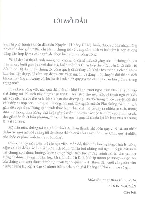 Đây là quyển sách thứ 2 trong bộ sách Hoàng Đế Nội Kinh gồm 9 quyển do Chơn Nguyên dịch và bình giải. Sách trình bày từ thiên 10 đến thiên 18, trong mỗi thiên được chia ra làm nhiều đoạn. Mỗi đoạn trong các thiên đều trình bày theo hệ thống: Phiên âm – Dịch nghĩa – Chú thích – Bình giải.