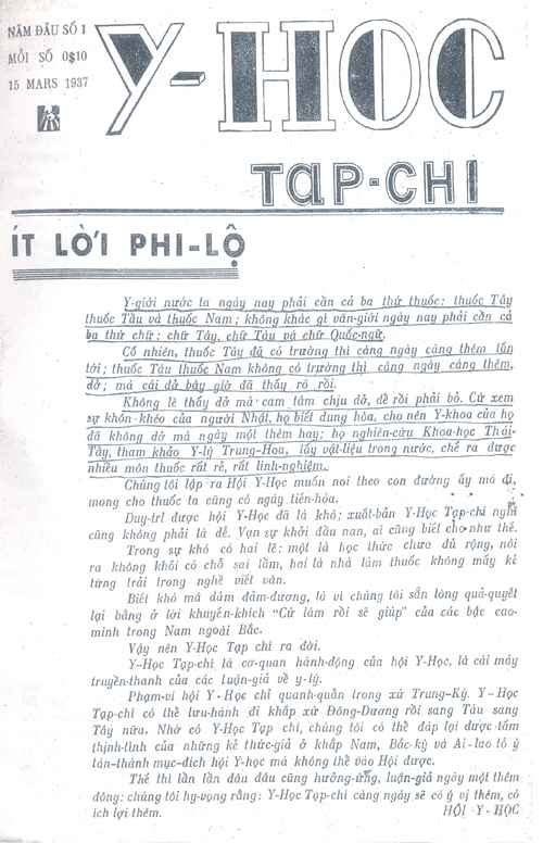 Với mục đích "Chấn hưng khoa thuốc nước nhà, luyện tập thầy giỏi, tìm kiếm thuốc hay, cứu giúp kẻ nghèo ốm", Hội Y học (lập năm 1936) đã cho xuất bản Y học Tạp chí - Tờ báo chuyên ngành đầu tiên của Y học Việt Nam,
