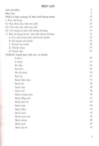 Phần hai- Cách bào chế các vị thuốc: Giới thiệu cách bào chế hơn 250 vị thuốc Đông y thường dùng, các vị thuốc được trình bày theo bố cục: Bộ phận dùng, thành phần hóa học, tính vị- quy kinh, tác dụng, kiêng kỵ, cách bảo chế và bảo quản.