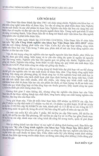 Được biên soạn nhân dịp kỷ niệm 55 năm ngày thành lập Viện dược liệu (13/4/1961-13/4/2016), cuốn kỷ yếu tập hợp nhứng công trình nghiên cứu khoa học của Viện dược liệu trong 5 năm (2011-2015).