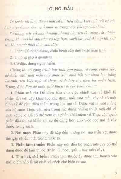 Các cây thuốc được giải thích theo các phần chính: Mô tả, nơi mọc, phần làm thuốc, thu hái chế biến, tính vị, tác dụng sinh lý, chủ trị, cách dùng thông thường, các cây có độc hoặc phải kiêng cữ.