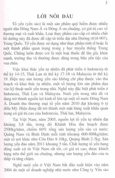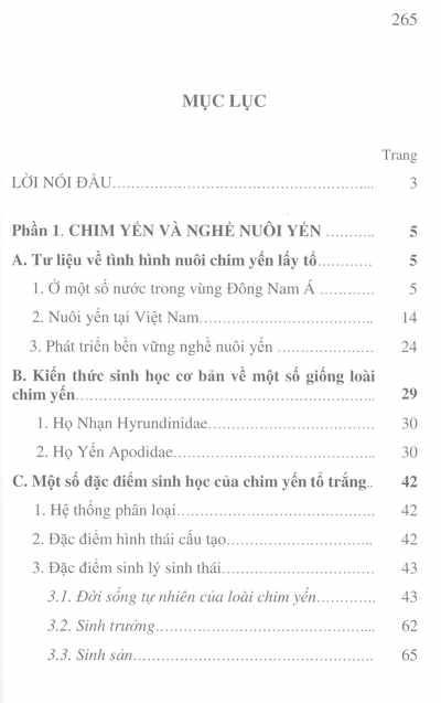 - Phần I- Chim yến và nghề nuôi yến: Tư liệu về tình hình nuôi chim yến lấy tổ, kiến thức sinh học cơ bản về một số giống loài chim yến và một số đặc điểm sinh học của chim yến tổ trắng.