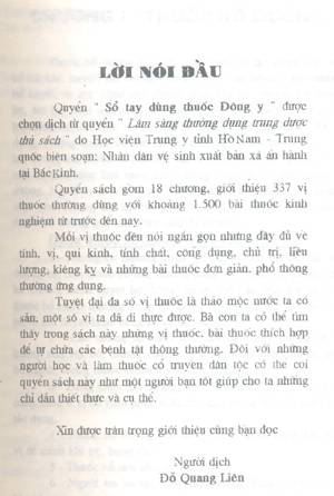 Quyển sách gồm 18 chương, giới thiệu 337 vị thuốc thường dùng với khoảng 1500 bài thuốc kinh nghiệm từ trước đến nay.