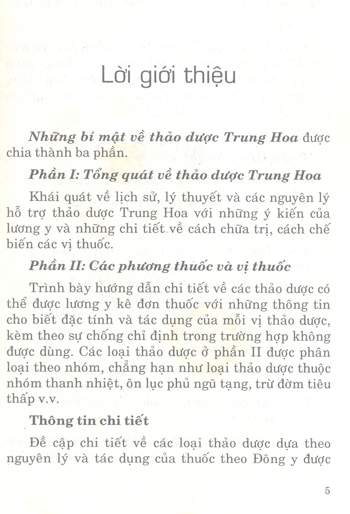 - Phần II – Các phương thuốc và vị thuốc: Bao gồm các thông tin tổng quát về mỗi loại thảo dược, gồm các đặc tính, liều dùng, công dụng và cách dùng truyền thống, sự phối hợp các vị thuốc và trường hợp kiêng kỵ đối với mỗi thảo dược.