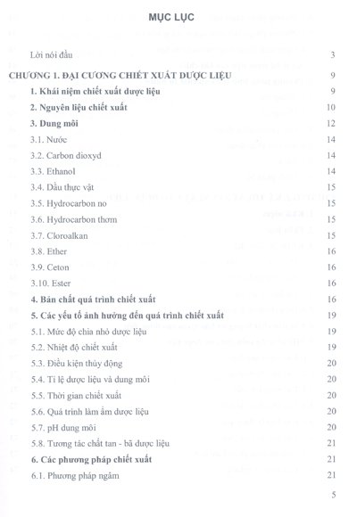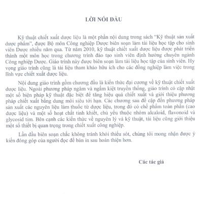 Giáo trình gồm chương đầu là kiến thức đại cương về kỹ thuật chiết xuất dược liệu. Ngoài phương pháp ngâm và ngấm  kiệt truyền thống, giáo trình có cập nhật một số biện pháp kỹ thuật đặc biệt để tăng hiệu quả chiết xuất và giới thiệu phương pháp chiết xuất bằng dung môi siêu tới hạn.