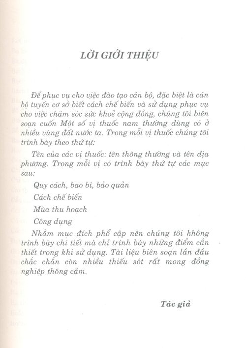 Để phục vụ cho việc đào tạo cán bộ, đặc biệt là cán bộ tuyến cơ sở biết cách chế biến và sử dụng thuốc, phục vụ cho việc chăm sóc sức khỏe cộng đồng, các tác giả biên soạn cuốn sách “Một số vị thuốc Nam thường dùng” có ở nhiều vùng đất nước ta.