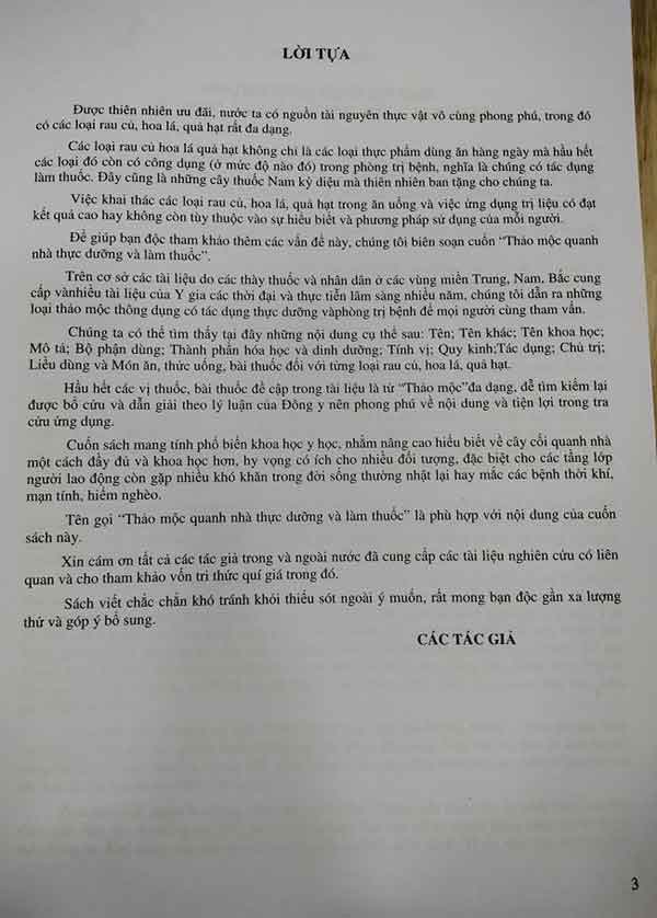 Cuốn sách mang tính phổ biến khoa học y học, nhằm nâng cao hiểu biết về cây cối quanh nhà một cách đầy đủ và khoa học hơn, hy vọng có ích chi nhiều đối tượng, đặc biệt các tầng lớp người lao động còn gặp nhiều khó khăn trong đời sống thường nhật lại hay mắc các bệnh thời khí, mạn tính, hiểm nghèo.