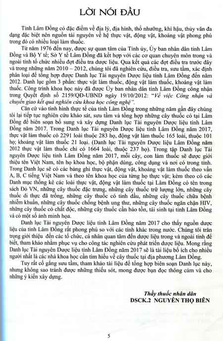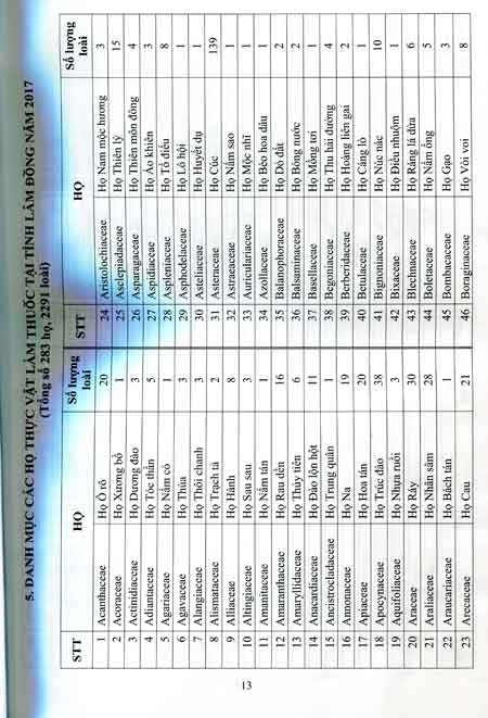 Trong “Danh lục Tài nguyên Dược liệu tỉnh Lâm Đồng 2017”, thực vật làm thuốc có 2291 loài thuộc 283 họ, động vật làm thuốc 165 loài thuộc 101 họ, khoáng vật làm thuốc 21 loại.