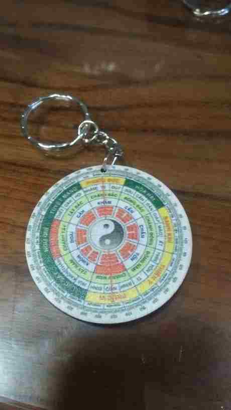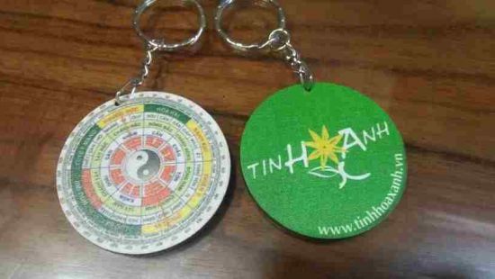 Móc khóa hình tròn, được làm từ chất liệu gỗ ép, nhẹ và in màu hai mặt