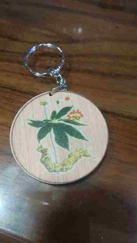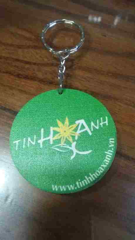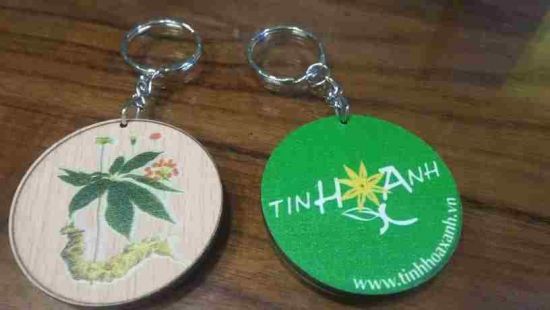 Móc khóa hình tròn, được làm từ chất liệu gỗ ép, nhẹ và in màu hai mặt