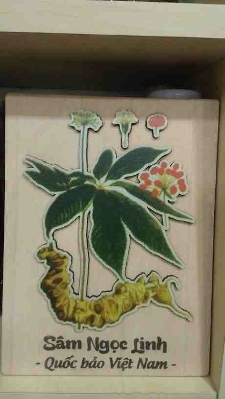 Ảnh Sâm Ngọc Linh được khắc nổi trên bề mặt gỗ với hình ảnh rõ nét, màu săc trang nhã, hài hòa